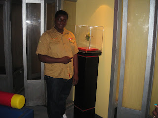 Paul spent some time talking with Hakeem and Mr. Brown about the contest, comics, Brooklyn (like me, Paul’s a native) and their school before we presented Hakeem with a few mementos of his visit, including the seriously cool JLA Trophy Room: Multi-Colored Kryptonite Replica Display, (seriously, I want one, too) and a copy of the original manuscript of The Kid Who Saved Superman. Hakeem was a little disconcerted to discover that the book, which had to be written before the contest winner was chosen so it could be published on time, featured not “Hakeem Bennett” in the starring role, but…Judy Porter?! I had just made up a name, which happened to be a girl’s name, and wrote the story with her taking Hakeem’s place. She was then replaced (along with “Ms. Shiner,” who served as the stand-in for Mr. Brown and P.S. 36K’s principal, Ms. Schneider, who was, unfortunately, unable to join us on the tour) by Hakeem and company by my editor at Stone Arch, Donnie Lemke.