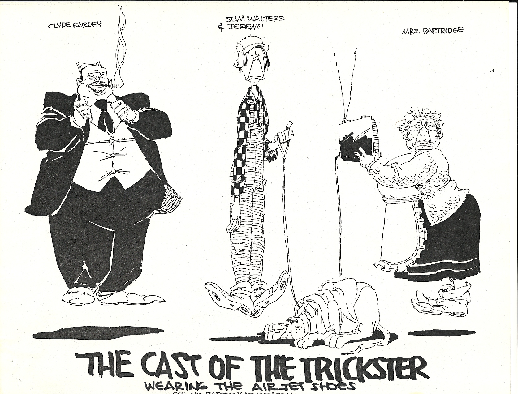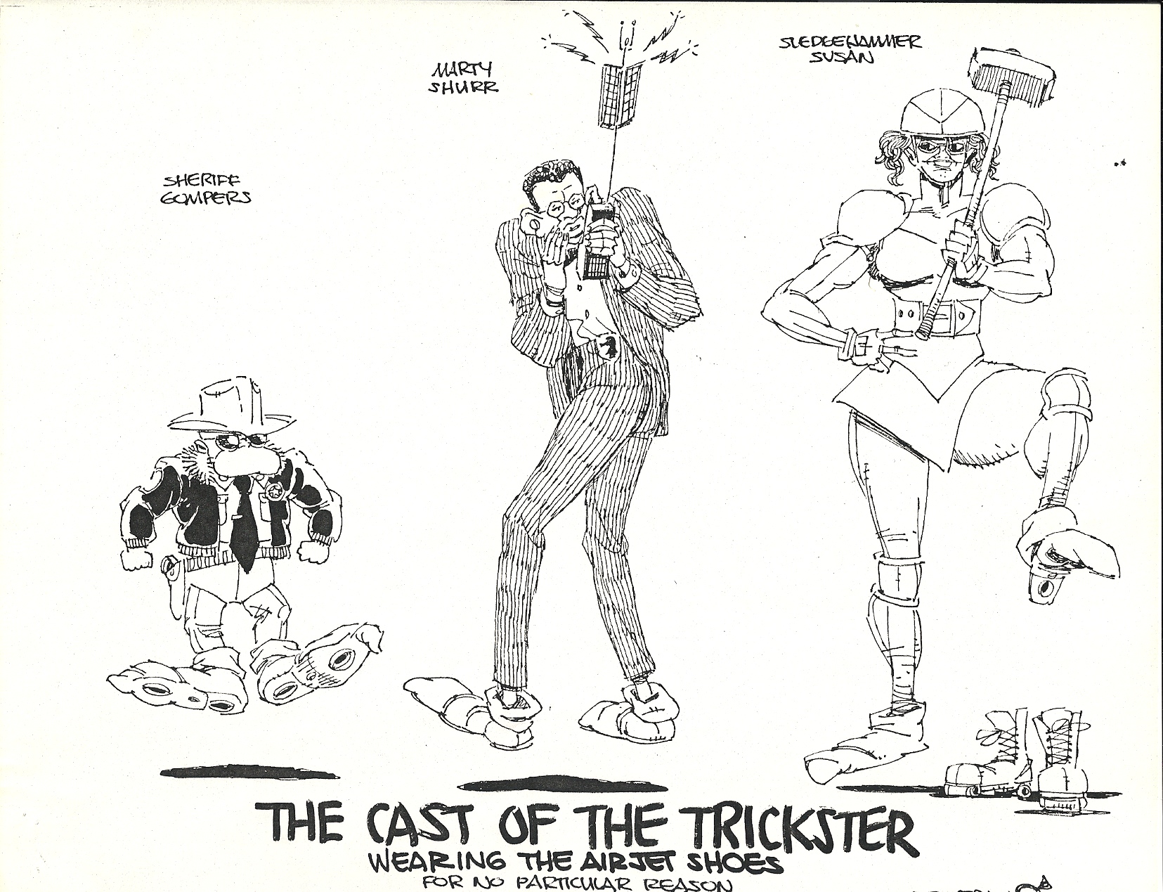 Walter Bunding thinks he’s got a solution to his problem. When he invited James in for a talk (in TRICKSTER #4), Bunding had secretly videotaped their meeting. While nothing of any real substance was said, it was a simple matter to edit the tape to make it appear as though James had gone to Bunding with an offer to get the Crumbly Mall plan squashed, thereby clearing the way for Bunding’s effort in exchange for big wads of cash. By releasing the tape on the eve of the election, there won’t be time enough for James to counter the charges. By the time James can prove anything, it’ll be too late.